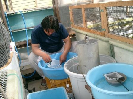 × [PR]上記の広告は3ヶ月以上新規記事投稿のないブログに表示されています。新しい記事を書く事で広告が消えます。 4月6日にセットし、8日の朝に産卵した、昭和三色「馬子」の仔達の黒仔寄りをしました。 朝からせっせと、二人でチュパチュパと、黒仔寄り。 無言で、せっせと黒仔寄り。 時々カウンターの音が、カチッっとなる。 はい、100匹! 無言。 我等、仲が悪いのではなく、ただただ寄った黒仔の数を数えているので、カウントを度忘れしないようにと… 時々、 「わっ☆」「しまった☆」 と、叫び声に似た奇声を発する。 それは、黒仔じゃない黄色い仔を吸ってしまった時!! 朝10時頃から夕方の五時までせっせと吸い取ると、二人で1万匹吸い取れました。 お昼と夕方に、稚魚池(中)に放養。 また、3月30日に稚魚池(海)に放養した大正三色の仔たちは、もう墨もしっかりとのり、大きくなってきました! ミジンコが大発生しているので、ドンドコ食べて、大きく育ってほしいものです♪ 正井養鯉場 http://sanke.ojaru.jp PR 大変遅ればせながら、先月28~29日に佐賀県鳥栖市にて催されました、第27回 錦鯉全国若鯉品評会の正井養鯉場取り扱い鯉の結果をお知らせいたします。 12部 大正三色 優勝次席 安藤様(正井養鯉場産)