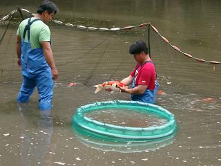 × [PR]上記の広告は3ヶ月以上新規記事投稿のないブログに表示されています。新しい記事を書く事で広告が消えます。 遅ればせながら、去る1月20・21日に東京流通センター展示会場にて催されました第38回全国日本総合錦鯉品評会の取り扱い会員入賞リストを掲載させていただきます。 12部 孔雀 優勝 15部 大正三色 準優勝 15部 大正三色 準優勝 15部 孔雀 優勝 15部 変り鯉 優勝 50部 大正三色 準優勝 55部 大正三色 準優勝 不甲斐ない結果ですので、春の若鯉の大会こそ頑張らねばと、意気込んでおります。 これからも、日々精進していく所存にございます。どうぞ宜しくお願いいたします。 正井養鯉場 http://sanke.ojaru.jp PR 謹んで初春のお慶びを申し上げます♪ 皆様、おこたを囲んで団欒されていらっしゃることと思います。寝正月もこれまた楽し。 さて、本年も正井養鯉場をどうぞ宜しくお願いいたします! 錦鯉における生産知識や技能に磨きをかけ、見事な錦鯉を世に送り出したく存じます! 明日、正月三日は、毎年恒例の?御節の会を当養鯉場事務所にて開きます。どうぞお誘いあわせの上ご参加くださいませ♪ 今回の御節は、娘も仕込から参加しておりますので、豪快なお料理となっております。ご了承くださいませ。 追記:昨年暮れの大晦日に記した文を公開し忘れ、正月二日に公開したた め、季節はずれな内容となってしましました。申し訳ございません。 恥ずかしい限りです。 こんな体たらくではございますが、本年もどうぞ宜しくお願いいたしま す。 明日は、正井養鯉場自家産の本命明け2歳大正三色の池揚げです。 「野池の取を務める」のですから、見事な仕上がりで、前回と同様に、全員無事に元気に揚がってきて欲しいものです。 昨日の夕方から池の栓を抜き、水深の調整をし明日へと臨みます。 さて、11月5日に行われた明け3歳~6歳にかけての野池の池揚げは、お蔭様で全員無事に丈夫に帰還いたしました。 明け3歳のくせに、といっては何ですが、14センチも伸びたり、3センチ伸び88センチで美しく仕上がってきた明け6歳など、嬉しい誤算もありました。 先に行われた、二度の野池の池揚げ風景を更新せねばと思いつつ、先週も睡魔に襲われ続け、ダウンの日々でした。 写真は、5日に行われた池揚げ風景です。 正井と正井兄が、放たれた65センチ以上の鯉たちを網でヒョイヒョイ掬っております。 胴長はともかく、この兄弟、どうして申し合わせたかのように原色のTシャツを着ているのか…。 正井兄は、本州からの助太刀なのに。 マリオブラザーズか? 正井養鯉場HPは、http://sanke.ojaru.jp です。 鯉屋さんをしていて、一年で一番至福の時がやって参りました♪ 明日は、待ちに待った池揚げ第二弾です。 一番下の池、明け3歳~6歳の鯉たちです。 昨日より準備をし、今朝からは野池の栓を抜き、水を落としております。 「一番楽しい瞬間やなぁ♪」 と、他の野池の鯉たちに餌を遣るときも、トラックに乗っているときも、ワクワクした声で、大正三色のあの鯉がどうたらこうたら、と正井はいつになく饒舌になっております。 明日、皆無事に大正三色たちが揚がってくることを祈っておいてくださいませ♪そして、キクが寝坊をせず池揚げへと臨められるか、という点に関しましても… 写真は、10月22日に明け二歳の池揚げをした時のものです。お蔭様で、大正三色も昭和も皆無事に揚がって参りました。 |