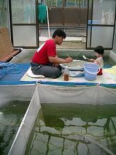 × [PR]上記の広告は3ヶ月以上新規記事投稿のないブログに表示されています。新しい記事を書く事で広告が消えます。 7月末にキクが脱水症状から腸炎になりダウン。30歳を過ぎてからの39度5分は、かなり体にこたえる。人の便とは到底思えぬものが一週間続き、白髪もまた増えた…。 この哀れな母の姿を目の当たりにした娘は、自立心が芽生えたのか?とうとうオマルで排泄が完璧にできるように! パンツトレーニングって、ある日突然できるようになるものなのですね! 7月下旬まで家中をおしっことうんちでマーキングしていた子が。 快進撃の娘の勇姿に涙・涙・嬉し涙♪ 8月2日に「パンツトレーニング卒業!」と、母子手帳に記しておこう♪ 娘は、オマルへと向かう際、 「おしっこになってきた。うんちにもなってきた。」 と、妙な日本語を発している。でも、もうすぐおしっこが出るんだ、と実感の涌く巧みな表現に感心してしまう。 ついでに、おまるで上手にできても「Never give up!」と叫んでる!お絵本の『Never Give Up』(CTP/Character Buildersの中の一冊)が娘の最近のお気に入りで、徐々に暗唱していっているせいか…。なんだか闘志あふれるパンツトレーニング。「I did it!」なんて言ってくれると、「おっ、できるなぁお主!」なのですが。 今回の写真は、大山養魚場寄贈のオマルにしようかと思ったのですが、あまりにも「おしっこ・うんち」満載でしたので、写真くらいは爽やかに♪と、4月26日に野池へ放養した大正三色の当歳の写真に致しました。現在は、この写真の姿とは似ても似つかぬ大きさに成長しております。三色は神経質なはずなのに、餌場にしっかり寄り付いてガツガツ餌を食べています。お彼岸から11月の池揚げにかけての追い込みで、更にどう化けていくのかが楽しみです♪ ♪愛すべし三色♪ PR 鯉屋なので、他の生物の販売はいかがなものかと思うのですが、 そういった、ちょっとした後ろめたさもありますので、HP上ではなくブログにての販売と致しました。一応、ドジョウは、コイ目ドジョウ科シマドジョウ属ですが… 天然・淡路島の野池(溜池)産 シマドジョウ 一匹 200円 18cm以上 500円 (どっしりとした体格の迫力があるドジョウ) 柄がくっきりと出ていて美しいドジョウ、ボリュームのあるドジョウ、青みのかかったドジョウなど、いろいろおりますので、サイズやどのような感じのドジョウがご希望かをメールにて教えていただければ、写真を添付して返信させていただきます。 10匹単位・100匹単位でのご購入も承ります。 商品以外の必要代金などは、正井養鯉場HPの「販売方法」の欄に記されておりますので、http://sanke.ojaru.jp にて検索、ご検討下さいませ。メールアドレスもHP上に記載されております。 ドジョウは、錦鯉を養殖している野池で共に育成しております。 水槽で飼いますと、ガラス越しから見える姿は、愛嬌があり、とても可愛いです♪上記の写真のようにタライで飼い、上からのぞくと、水中のハムスターみたいでしょ♪お髭がとってもチャーミング☆ ドジョウは生命力が強いので、小さなお子様でも飼育が可能です。うちの娘(2歳半)で証明済みです。生き物との触れ合いの第一歩としてもドジョウは子供たちの良いパートナーと成り得ると思います。また、表情も豊かな上、体をクネクネくねらせて水面へと酸素補給に上がってきたりもしますので、観察の楽しみも大いにあることから、夏休みの自由研究にもお勧めです。 雑食性なので、ご飯の残りやお麩、パンくず、イトミミズ、ちりめん、煮干なども食べます。餌をあえて購入する手間も省けるので、その点でも飼育が楽です。金魚の餌でも可です。 ですが、 ・ちょっと臆病なところがあるので、おどかさない。 ・植木鉢の割れたものなどでお家を作ってあげる。 ・酸素を多く必要とするので、エアーポンプをしっかり噴かせる。 ・水が濁ったら水の入れ替えをする という心配りを心がけてくだされば、長生きしますよ! 一方、食用として、丸鍋・柳川鍋・ぬき鍋・どじょうの蒲焼などにもどうぞ! 17日、京の都で祇園祭の山鉾巡行をしている頃、 淡路島の正井養鯉場では、大正三色を放している稚魚池Kiの網曳き。そして、自宅へ持って帰り選別!選別!選別! ひたすら選別。 18日のお昼前までかかりました。 約10万匹が、一次選別により2200匹に。 夕方、野池の餌遣りの時に、稚魚池Kiへ再び放養。 元気に大きく育ってね! 19日、孔雀を放している稚魚池Kaの網曳き。同様に、選別!選別!選別! 腰と肩、首が痛くとも選別! 孔雀は、一日で選別が終了し、夜7時に再び稚魚池Kaへ放養。 約5万匹が、一次選別により2333匹に。 元気に大きく育ってね! 弊社は、大正三色に命を掛けており、次いで昭和(とても良い親がいるので)・紅白(あまり関心はないですが)の三種を主に取り扱っております。 弊社のHPは、■■■です。 弊社の初の試みとして、孔雀の産卵・選別。 主に三色の育成、選別ばかりをしていた私どもにとって、孔雀の仔たち