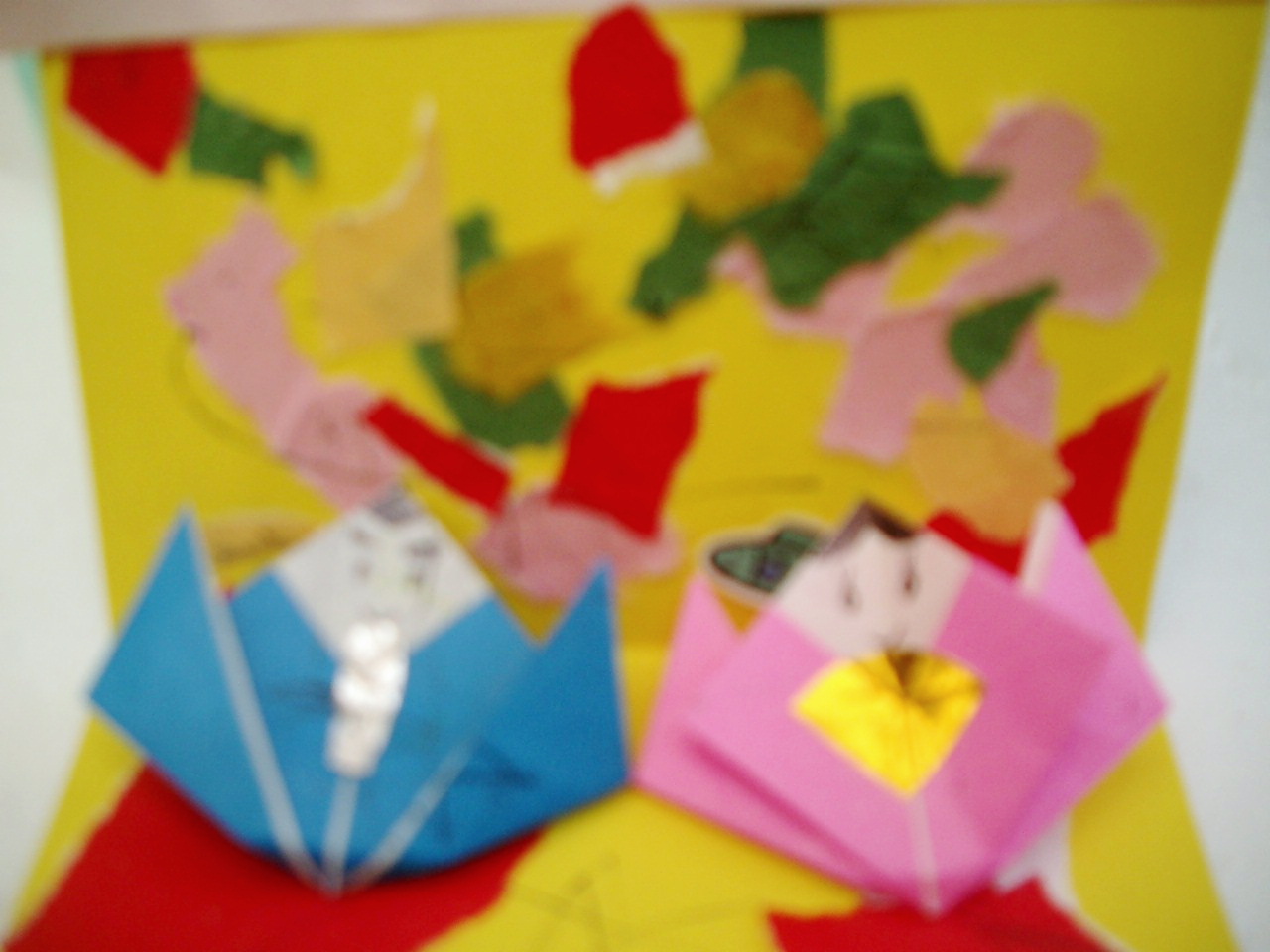 ピンボケなのはご愛嬌…乳幼児の集まる遊びの広場(ぞうさんのおへや)で娘と学んだ、雛祭りのお雛様を完成させました!お内裏様のお顔が、デビルマンのようです。娘の力作です!